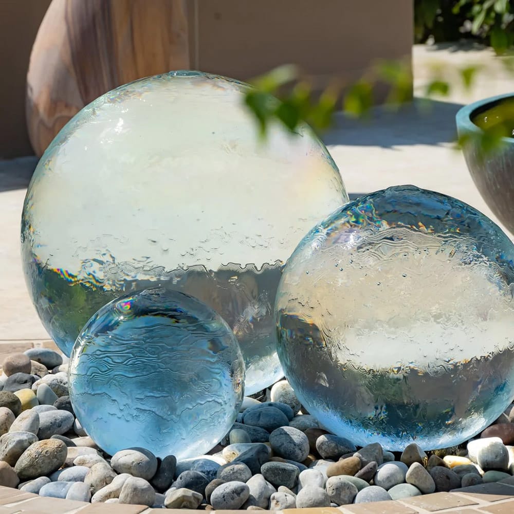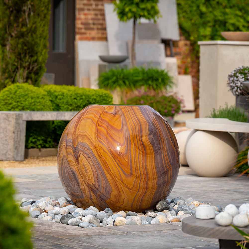- Eight running water features crafted from slate, sandstone, glass, marble and acrylic