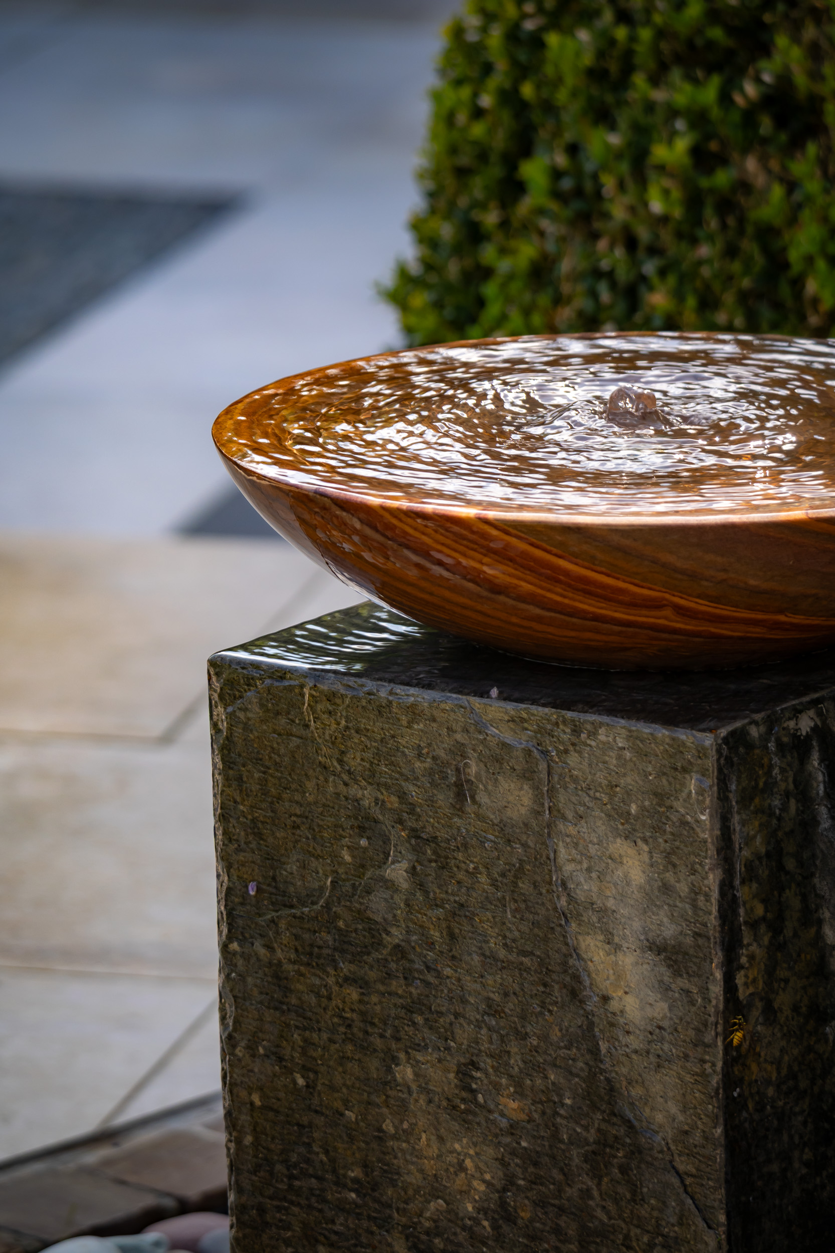 When introducing a new water feature, we chose this special place as inspiration, the angular lines of the building and the ruggedness of the Scottish countryside reflected in the column of slate and the softness of the turrets mirrored in the natural stone bowl which sits on top.