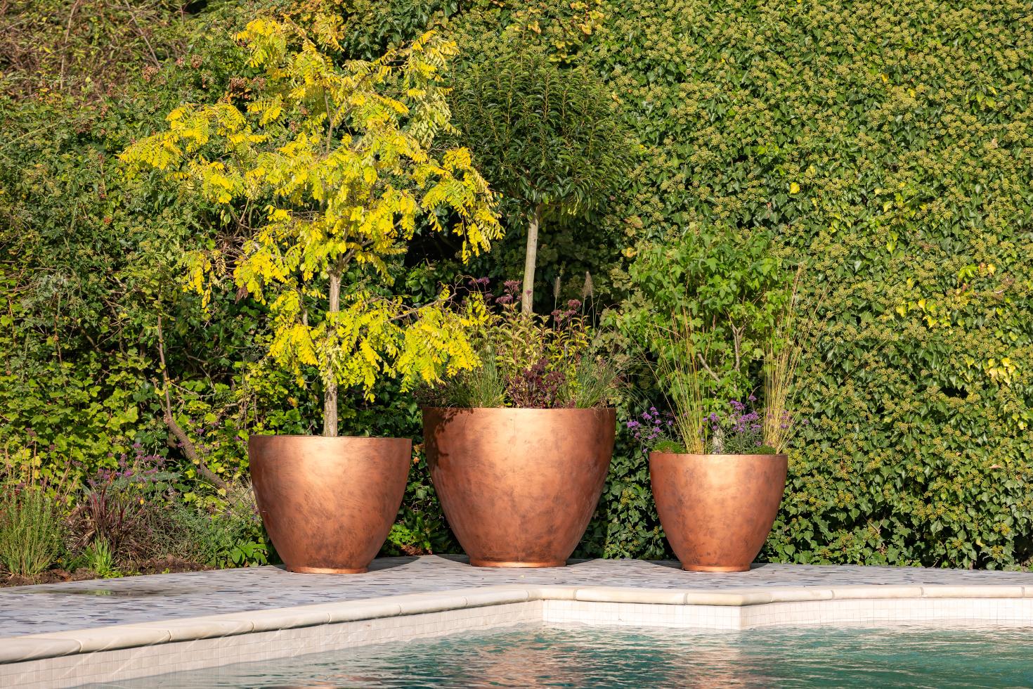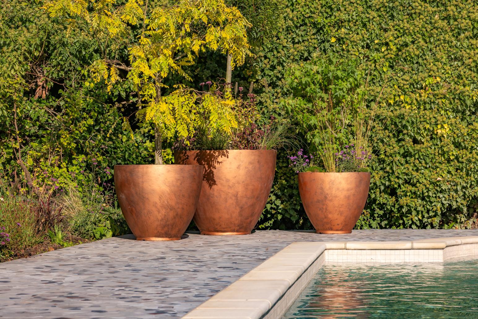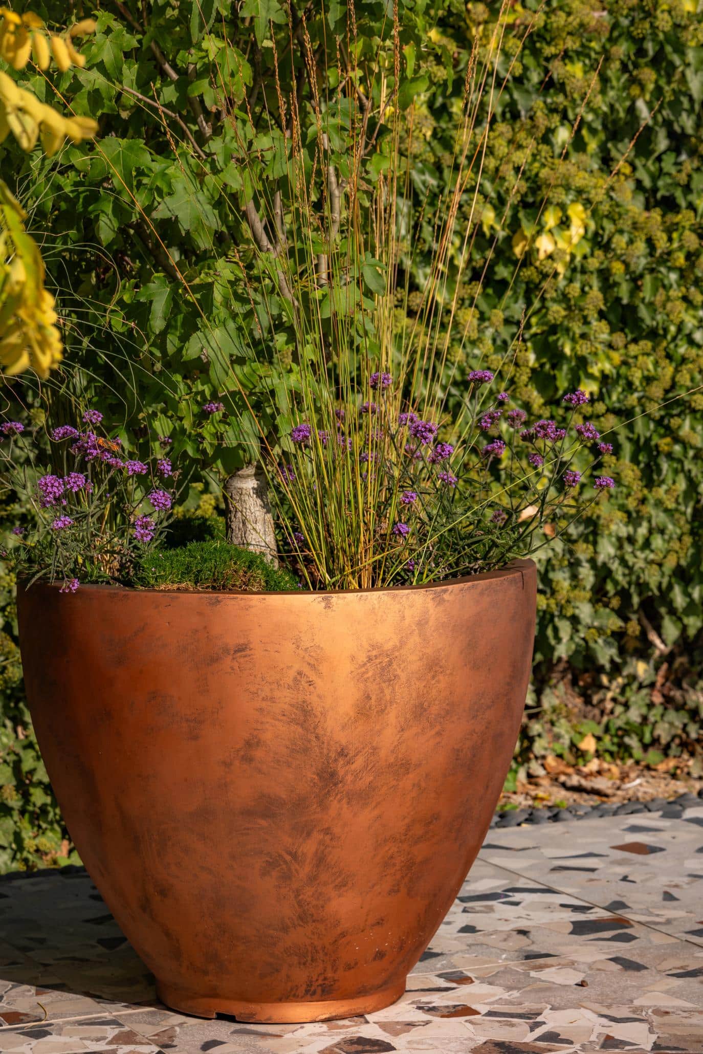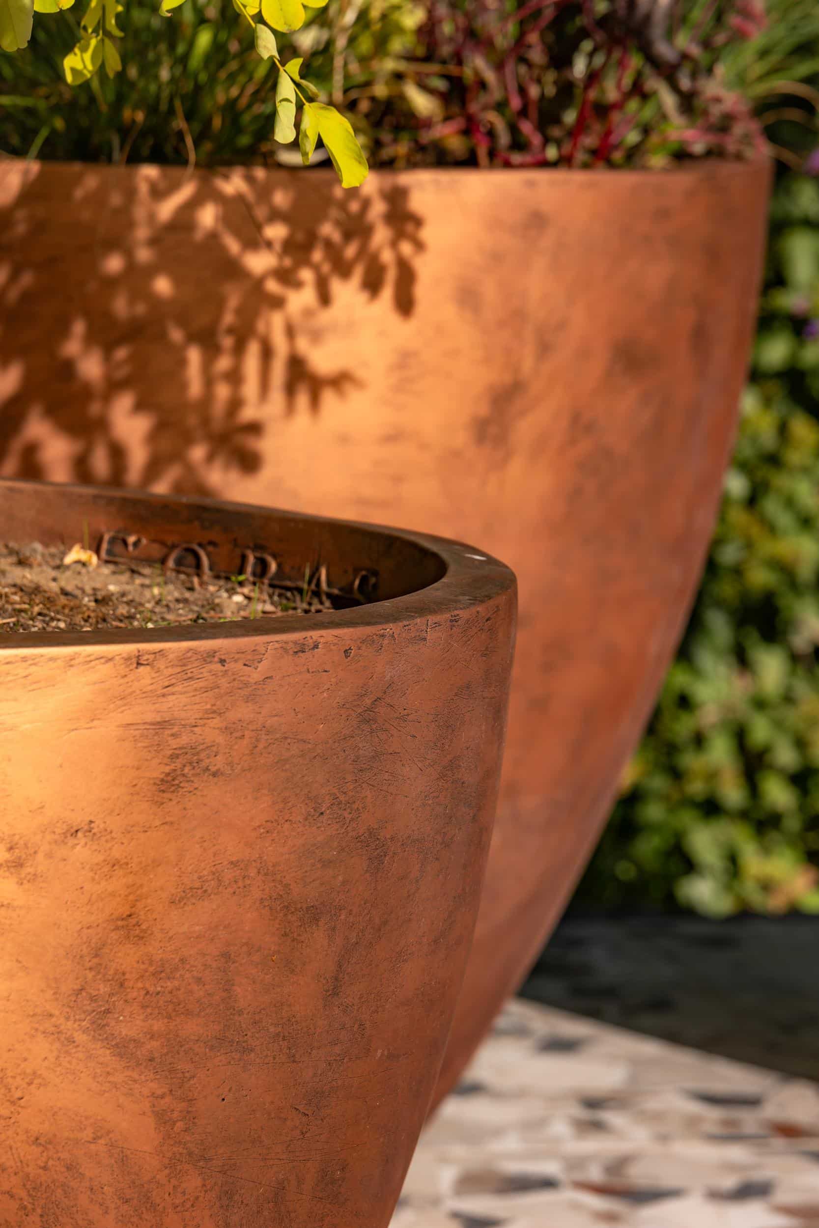 Our Patina Supreme Planter introduces a subtle metallic lustre that comes alive in sunlight, glowing with warmth and depth throughout the day. Its rich tones provide the perfect backdrop for colourful planting – from deep greens and silvery foliage to bold blooms, enhancing their vibrancy and creating a truly show stopping display.