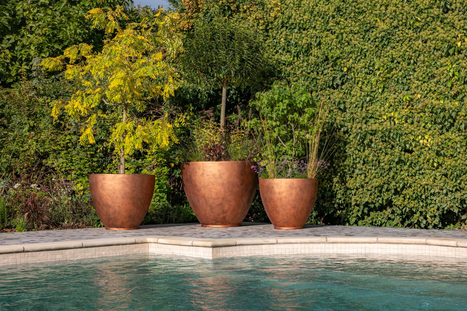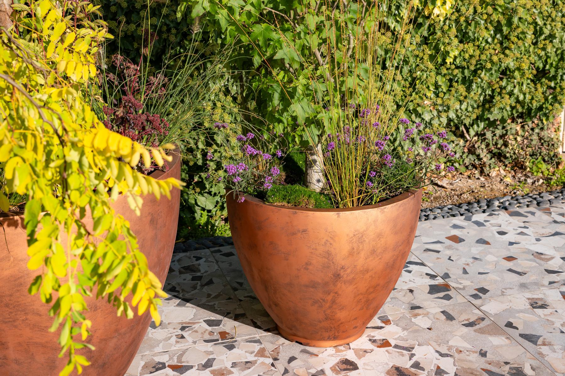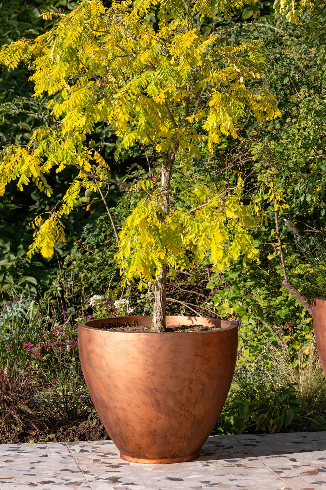 Our Patina Supreme Planter introduces a subtle metallic lustre that comes alive in sunlight, glowing with warmth and depth throughout the day. Its rich tones provide the perfect backdrop for colourful planting – from deep greens and silvery foliage to bold blooms, enhancing their vibrancy and creating a truly show stopping display.