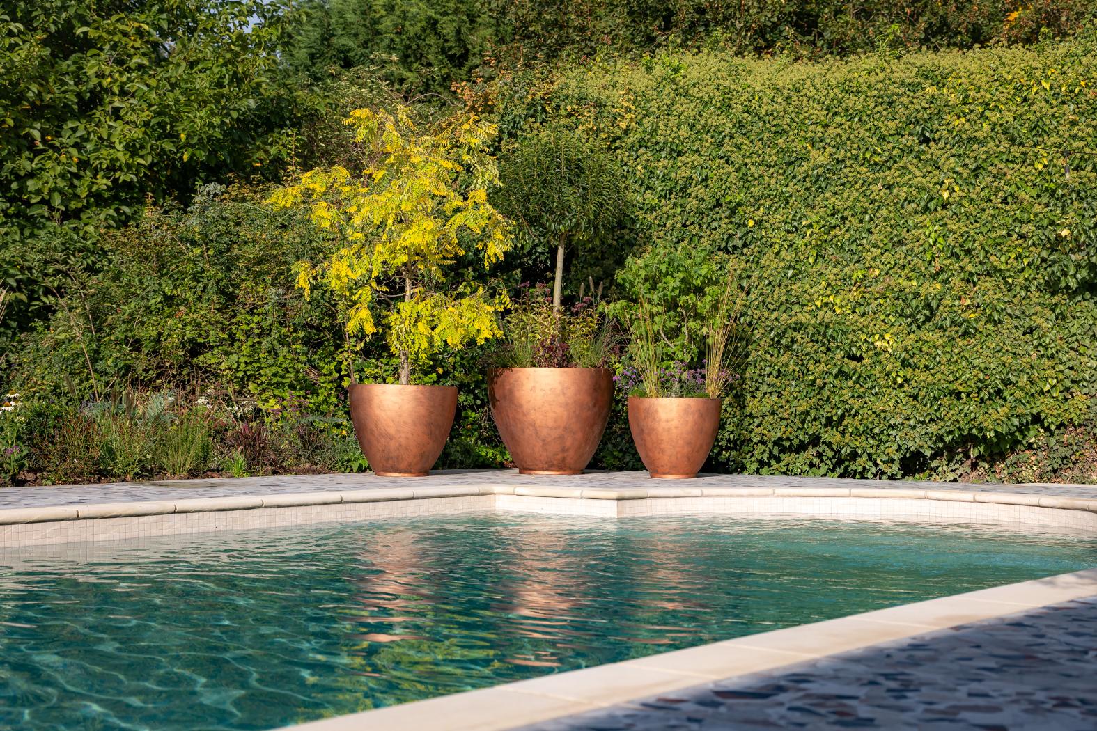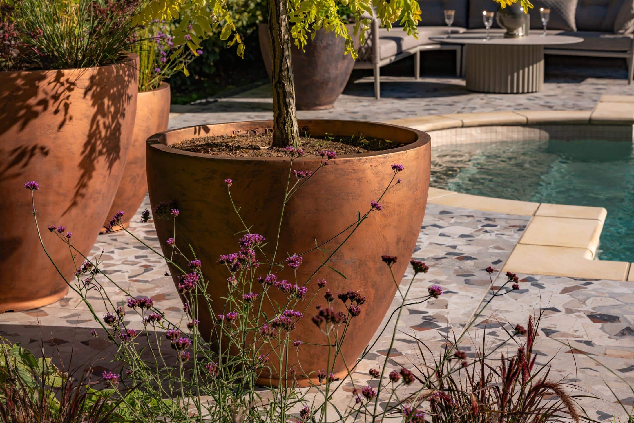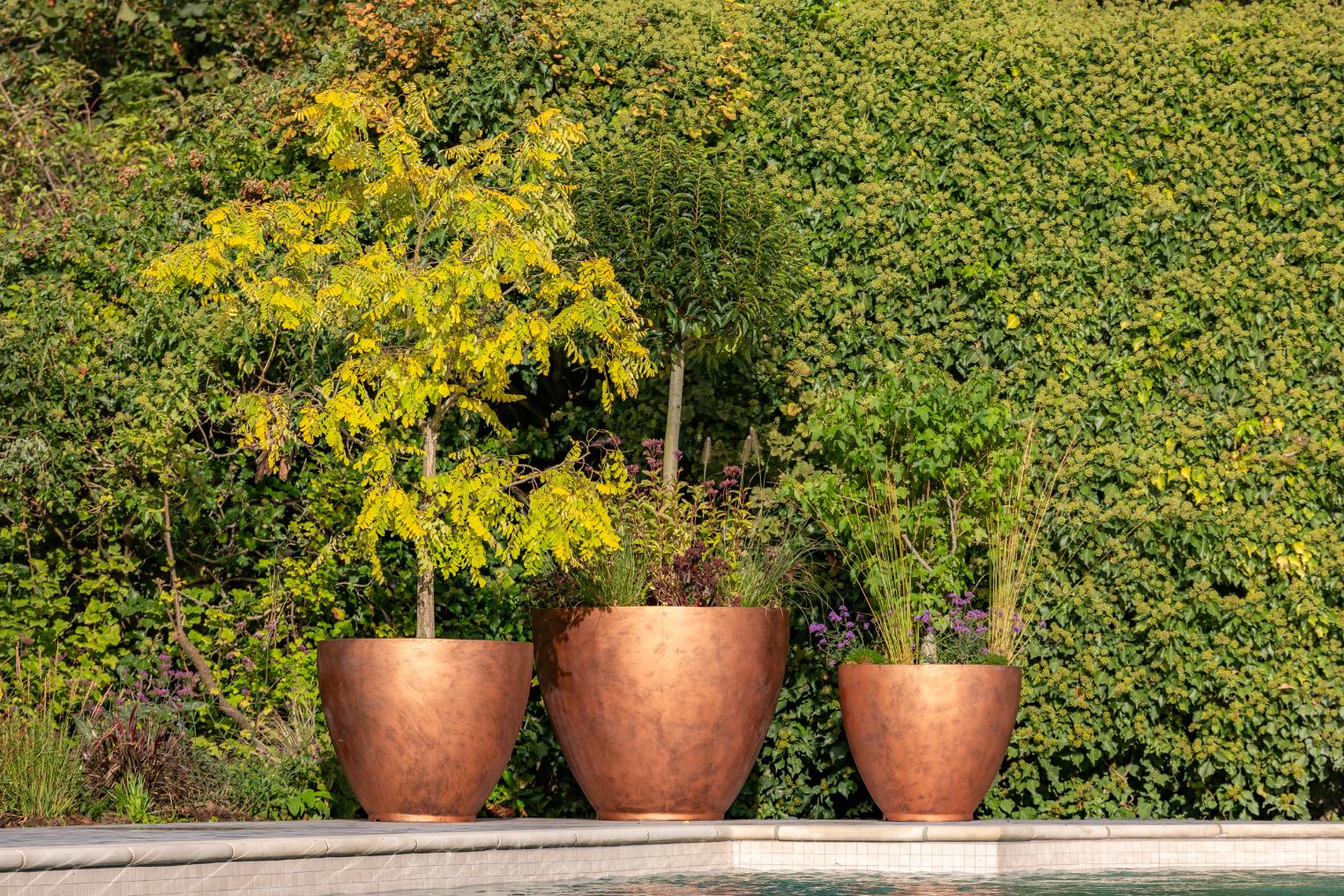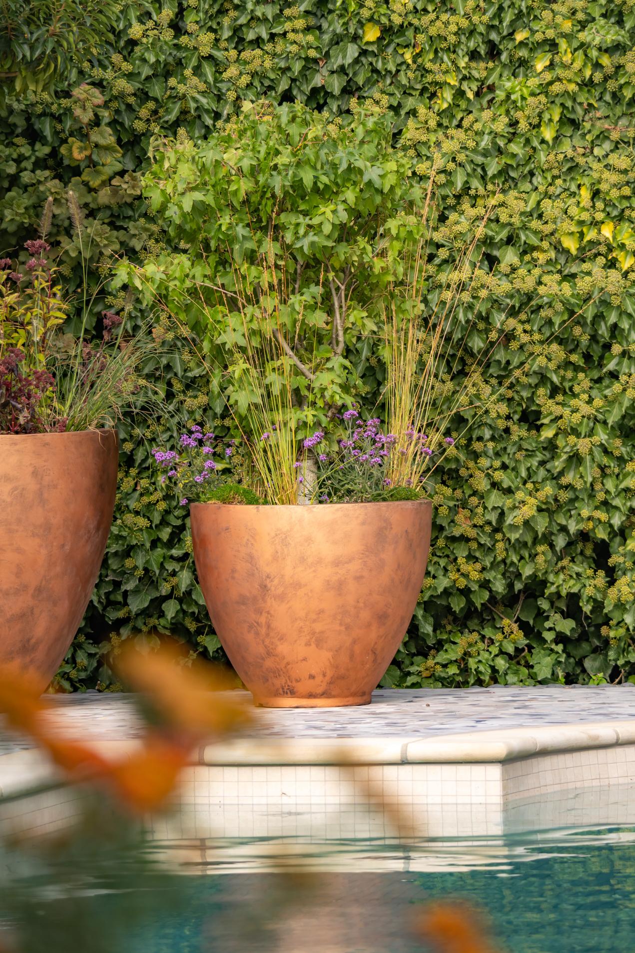 Our Patina Supreme Planter introduces a subtle metallic lustre that comes alive in sunlight, glowing with warmth and depth throughout the day. Its rich tones provide the perfect backdrop for colourful planting – from deep greens and silvery foliage to bold blooms, enhancing their vibrancy and creating a truly show stopping display.
