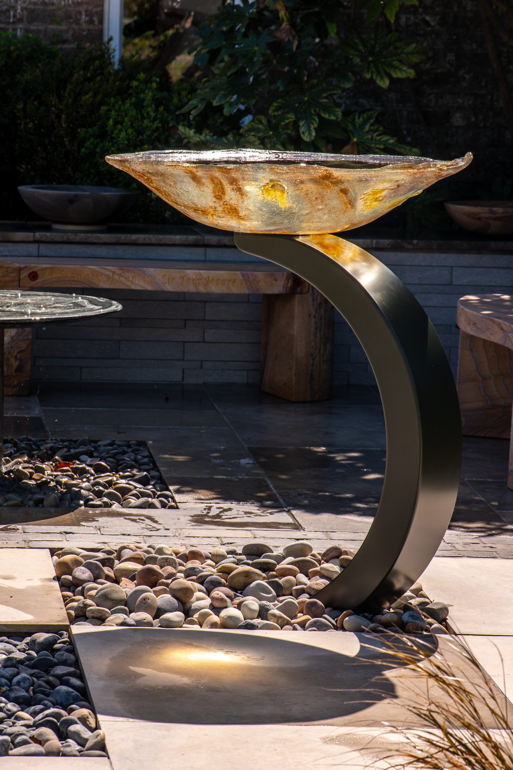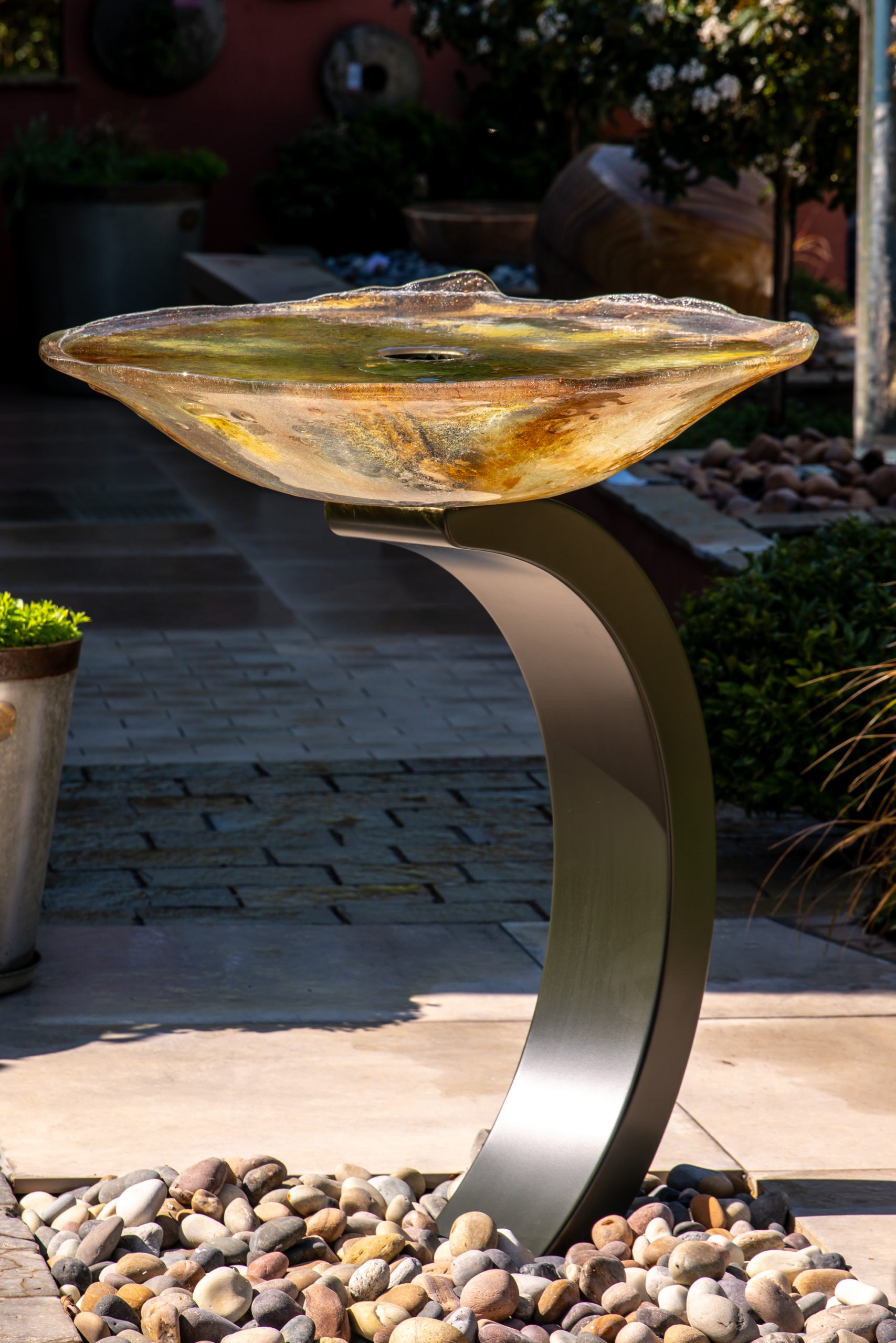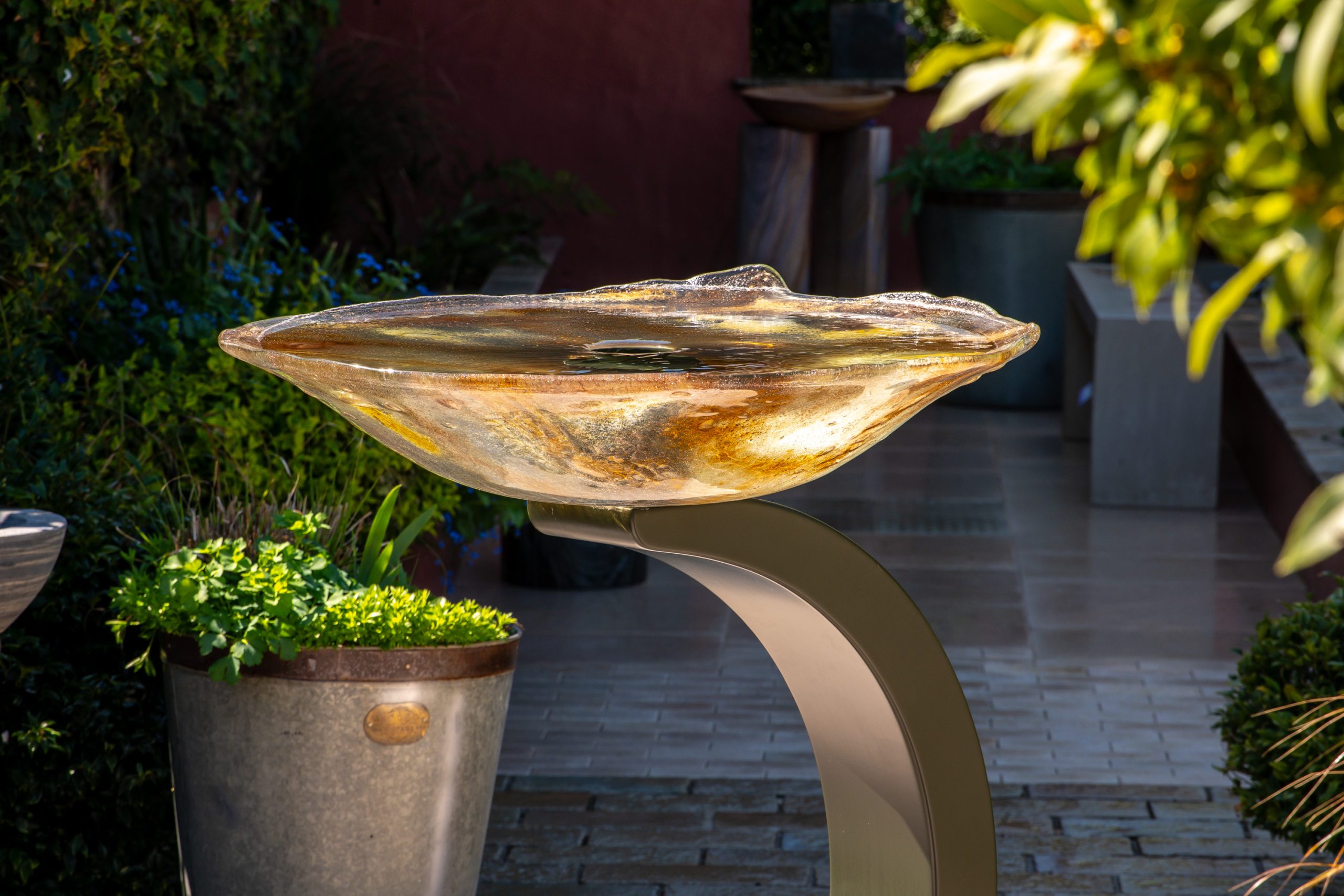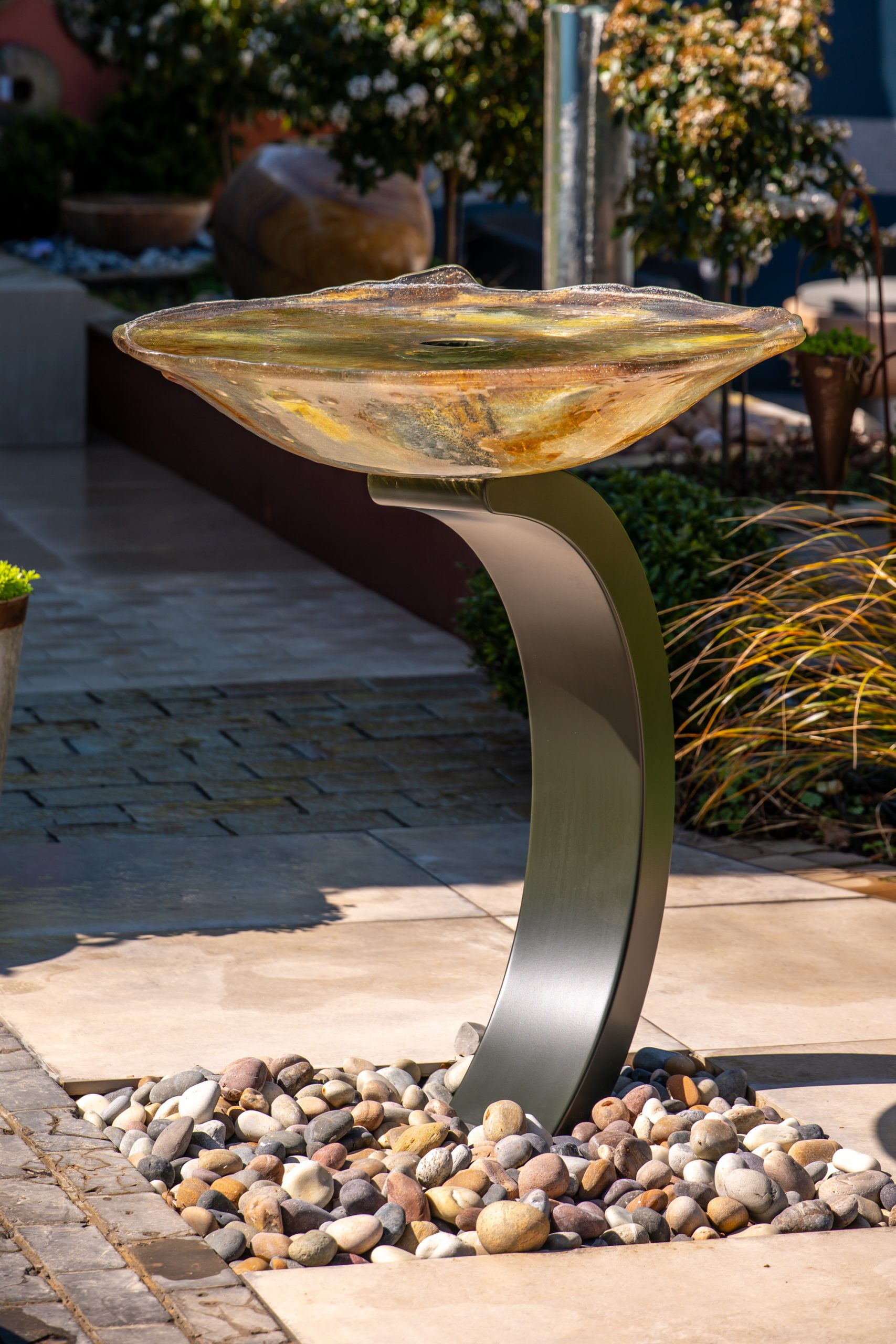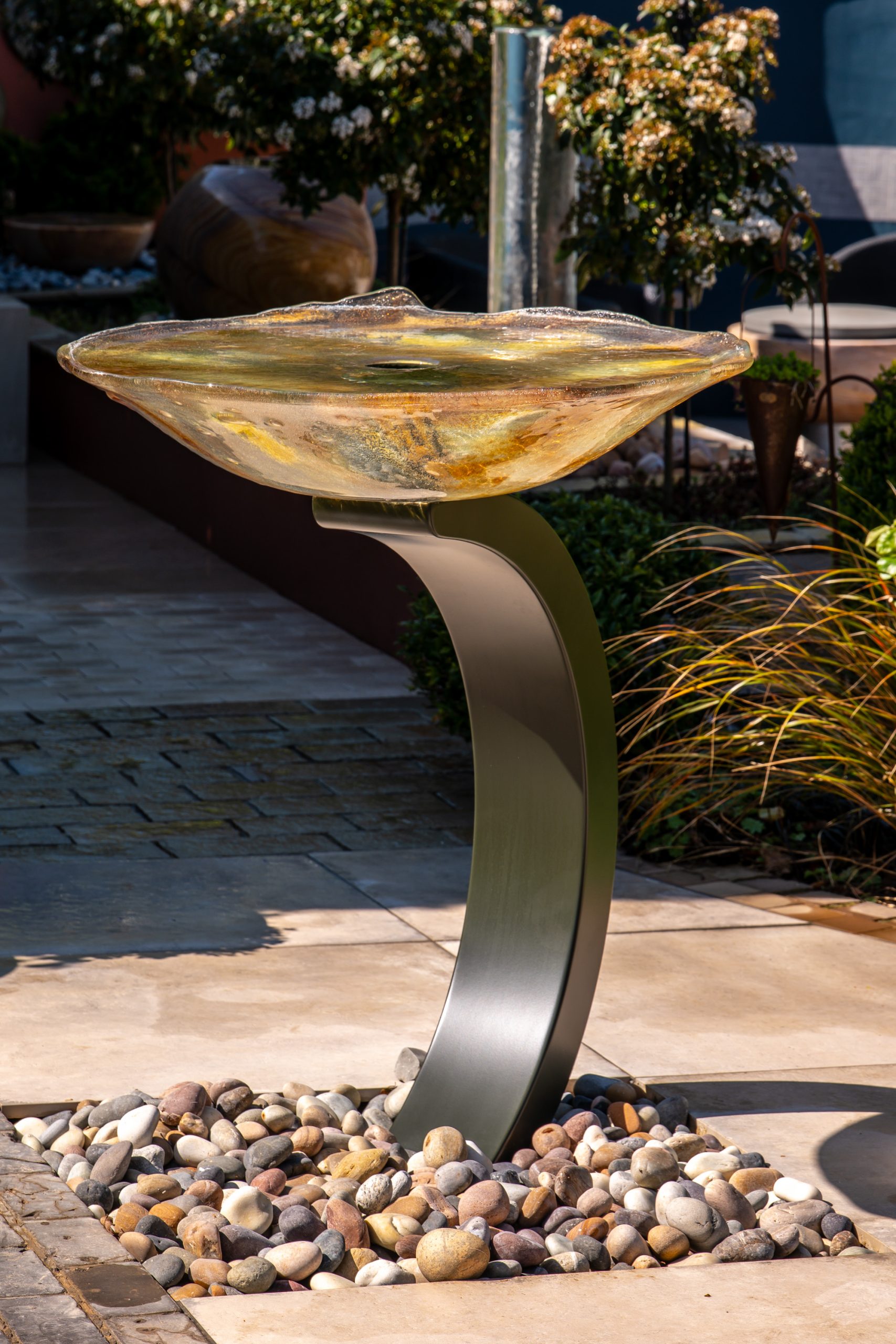 An elegant and contemporary water feature, the Shard Font showcases a hand-crafted glass bowl balanced on a sleek, curved metal stand. Self contained, this unique water feature creates a gentle ripple effect bringing movement, light, and a sense of calm to any outdoor space. Combining each unique bowl with water to create a bespoke moving work of art.