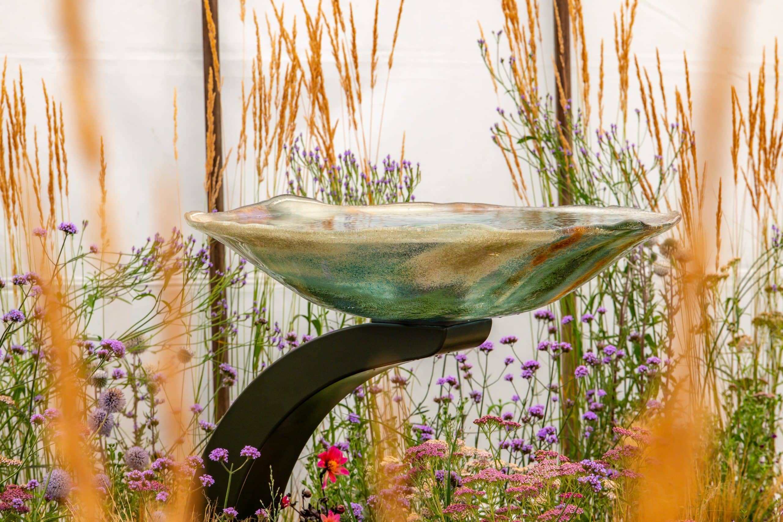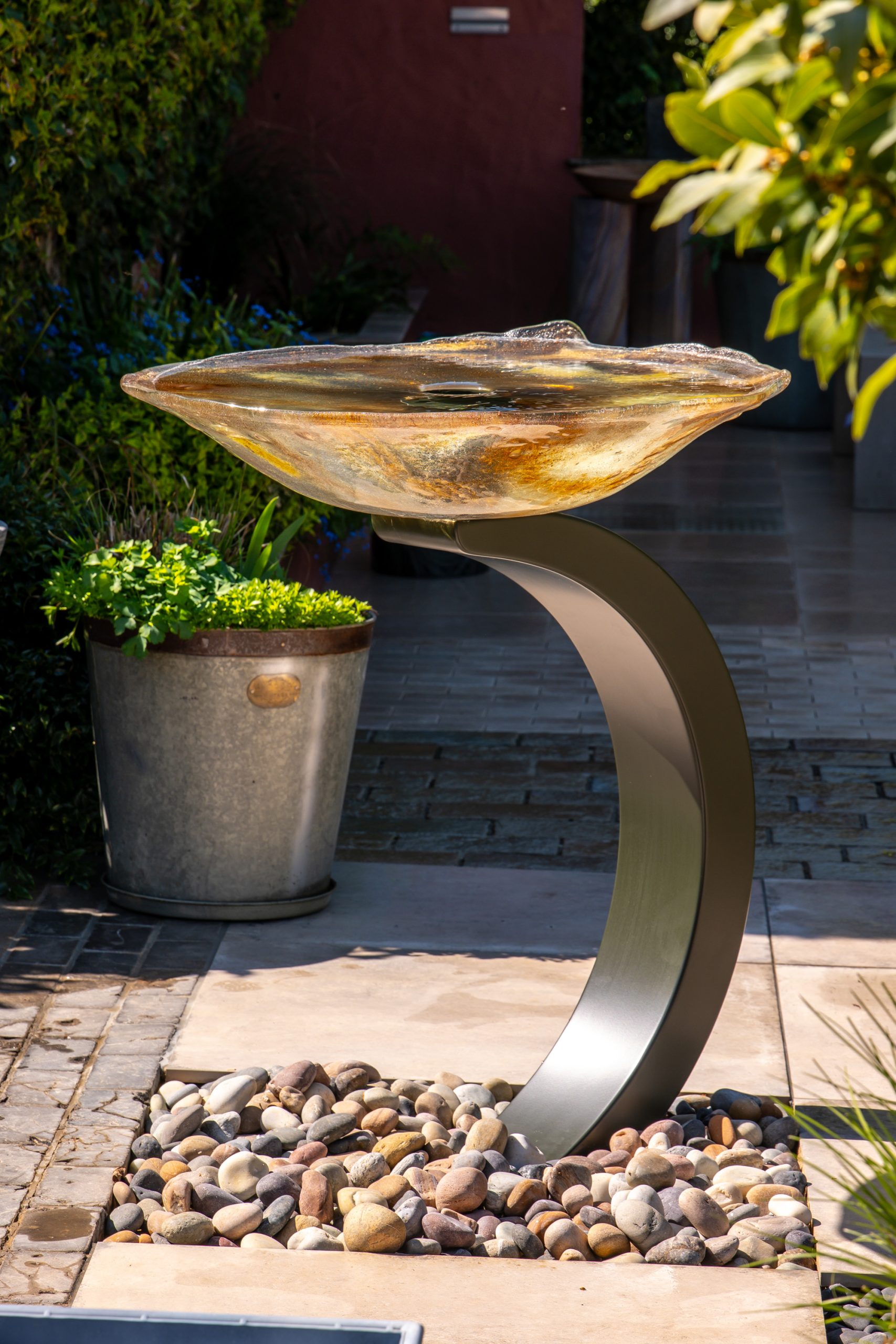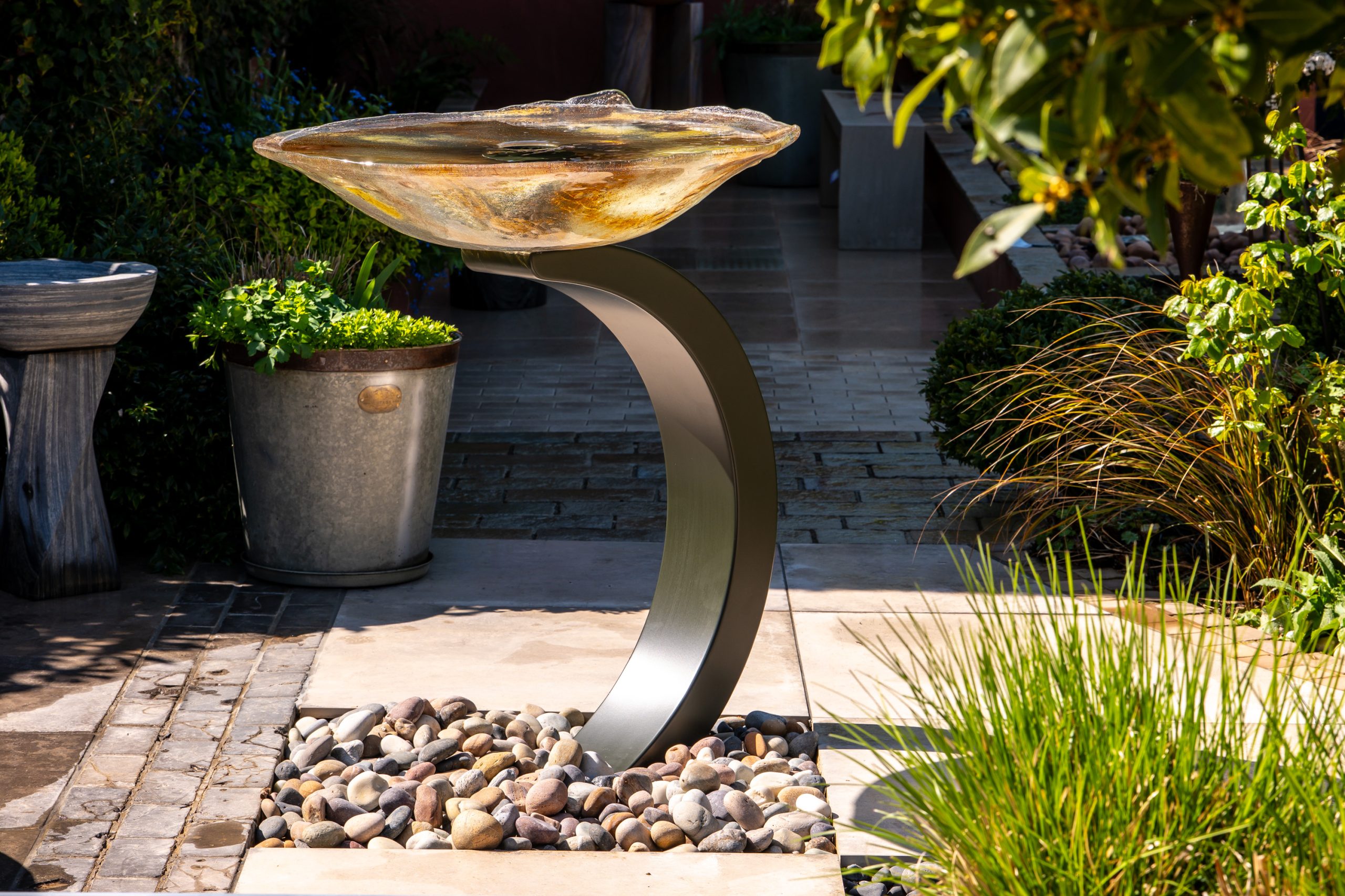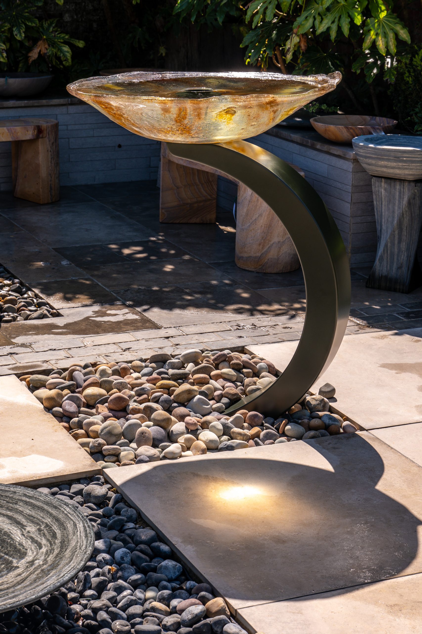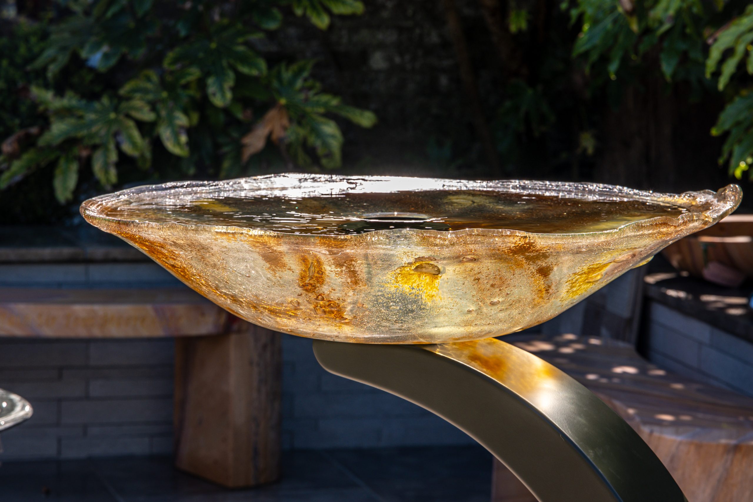 An elegant and contemporary water feature, the Shard Font showcases a hand-crafted glass bowl balanced on a sleek, curved metal stand. Self contained, this unique water feature creates a gentle ripple effect bringing movement, light, and a sense of calm to any outdoor space. Combining each unique bowl with water to create a bespoke moving work of art.