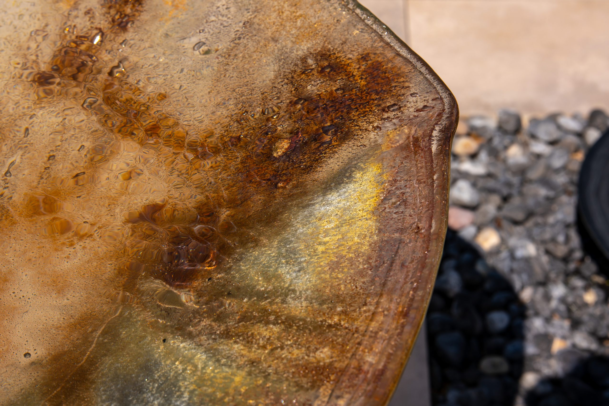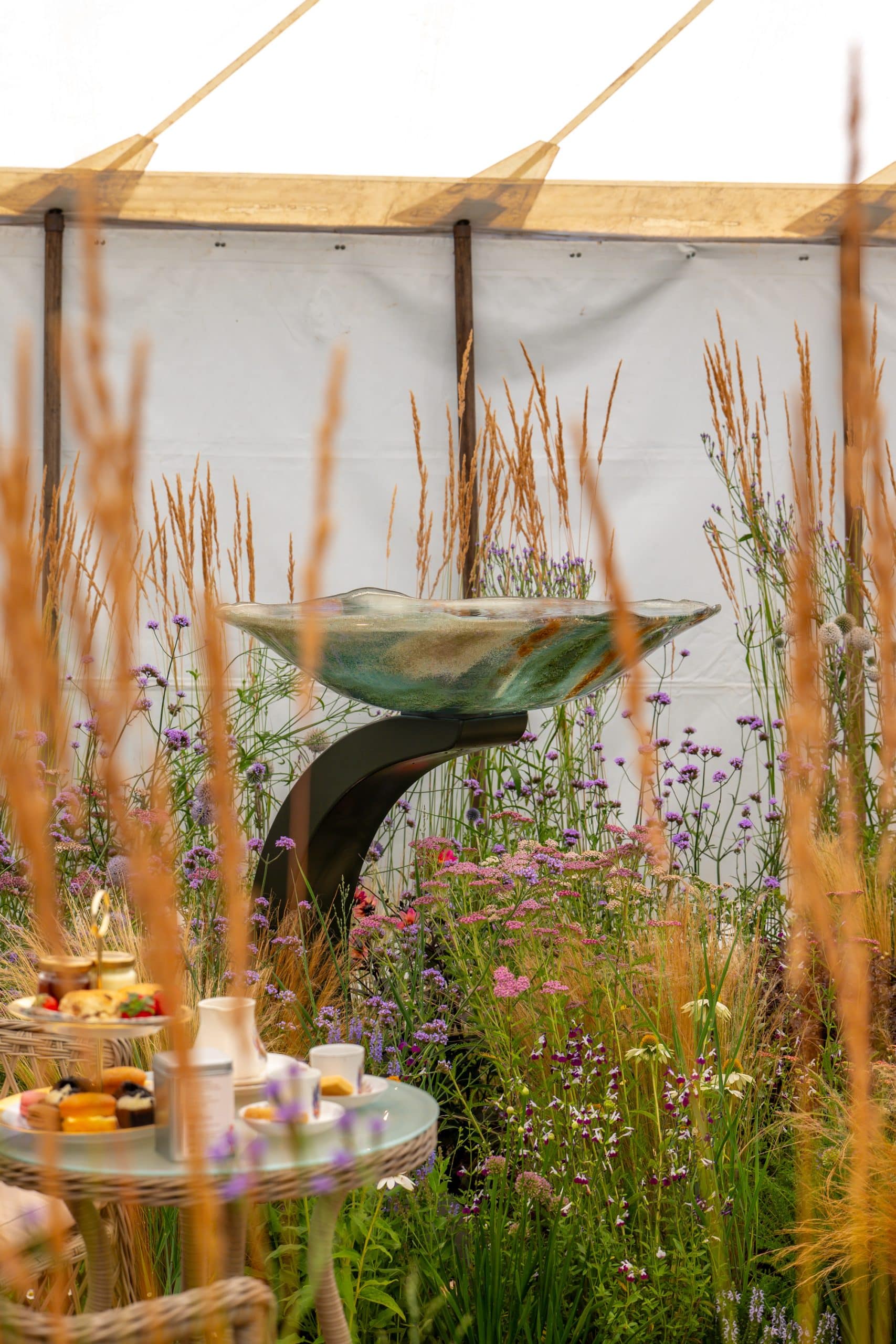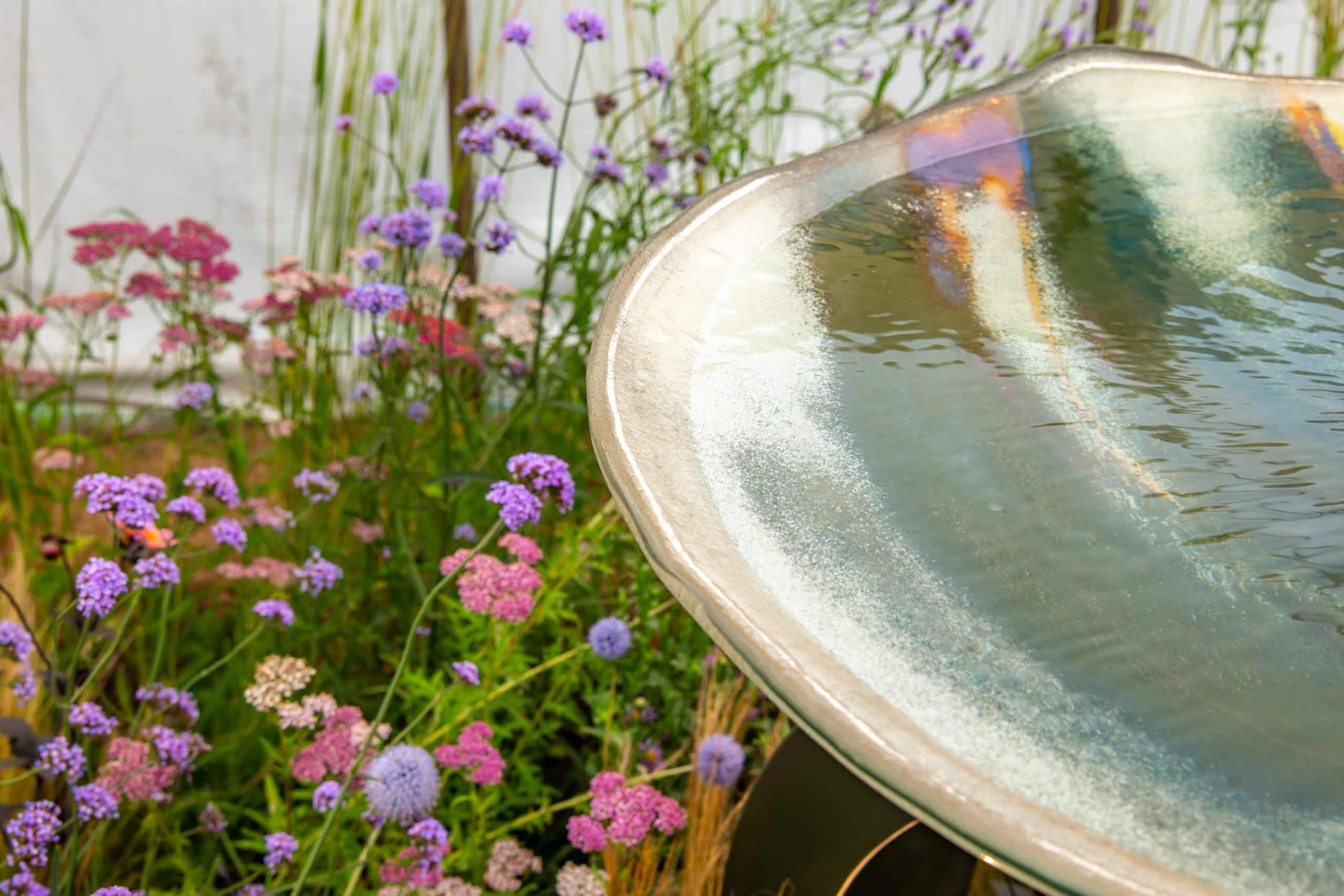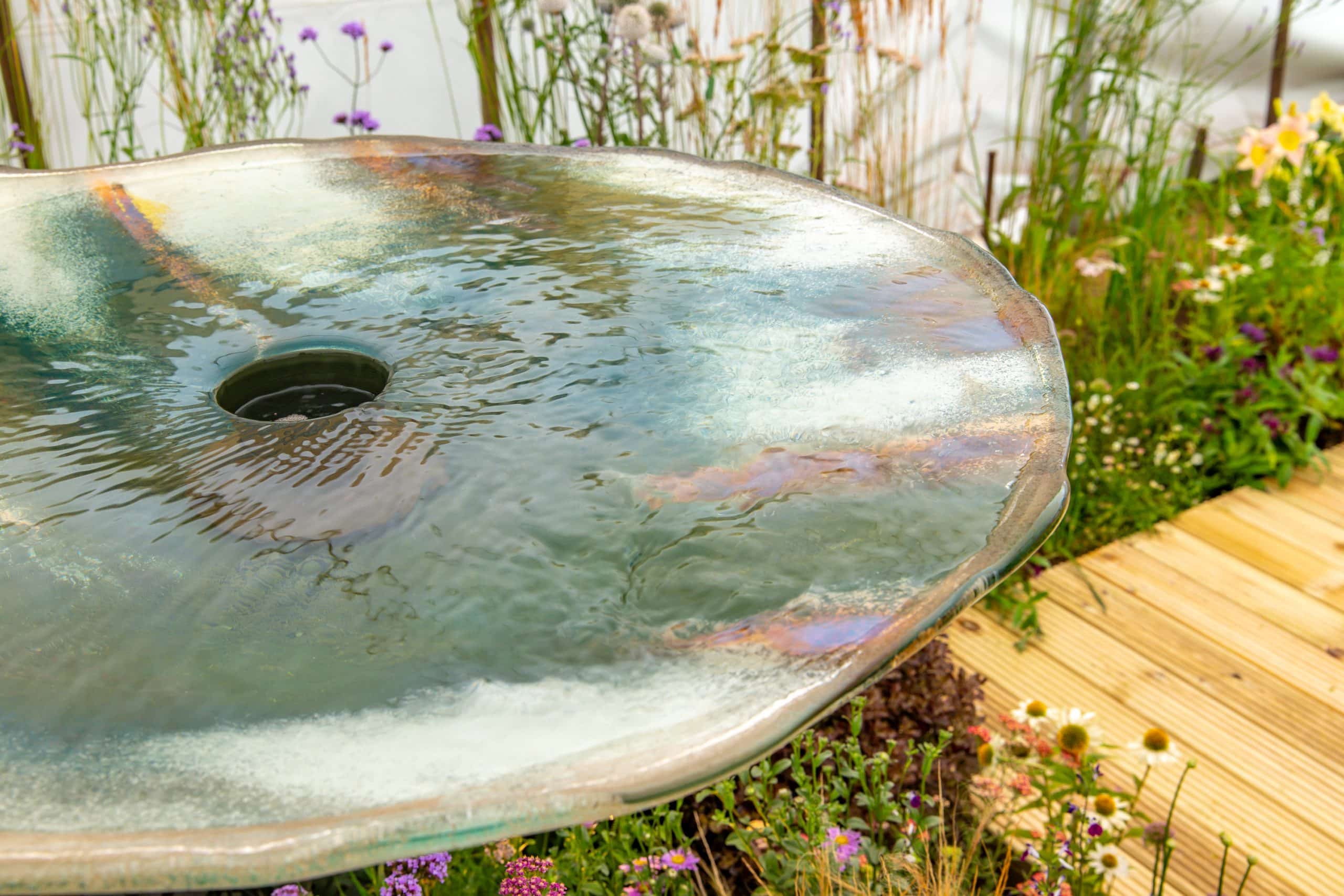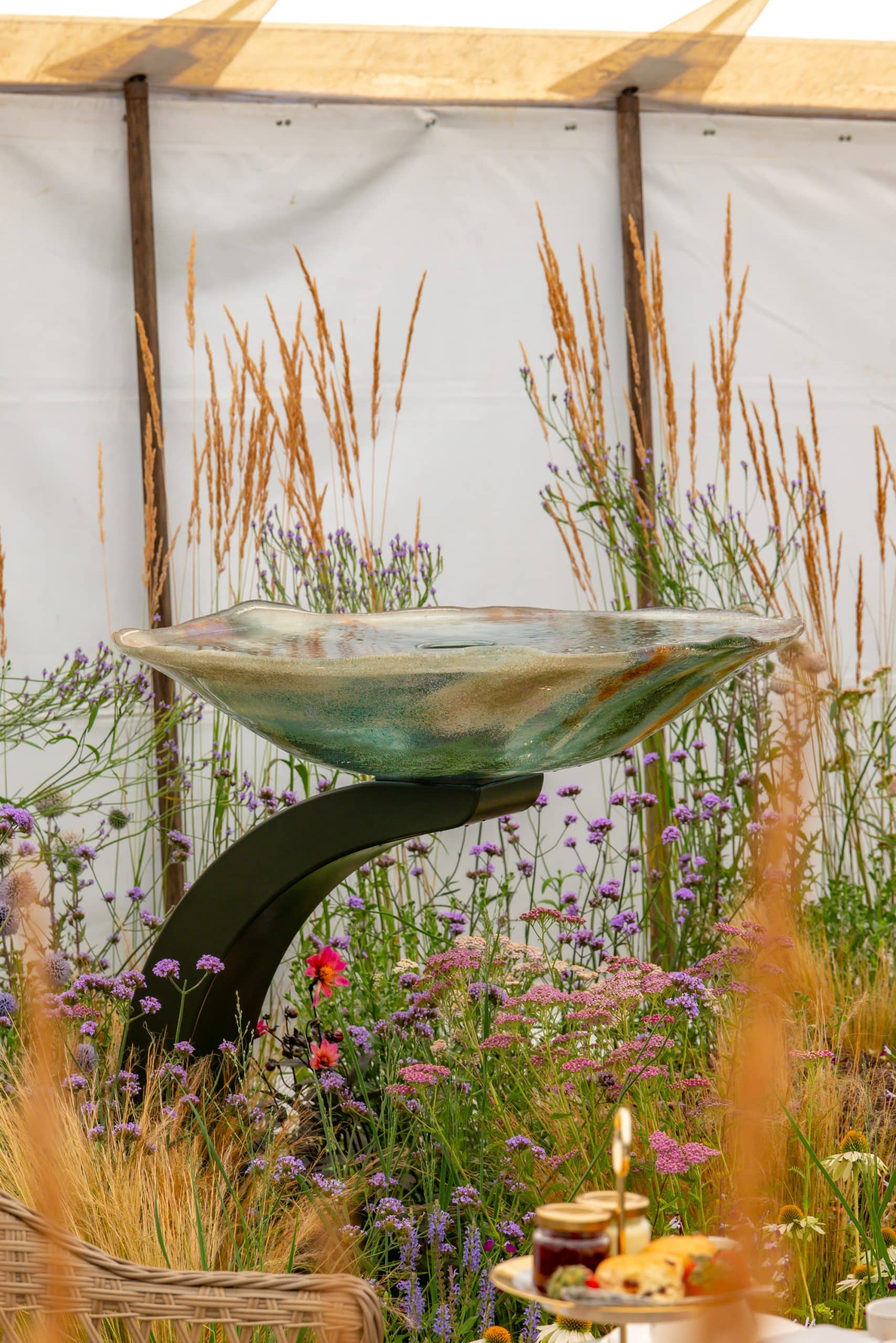 An elegant and contemporary water feature, the Shard Font showcases a hand-crafted glass bowl balanced on a sleek, curved metal stand. Self contained, this unique water feature creates a gentle ripple effect bringing movement, light, and a sense of calm to any outdoor space. Combining each unique bowl with water to create a bespoke moving work of art.