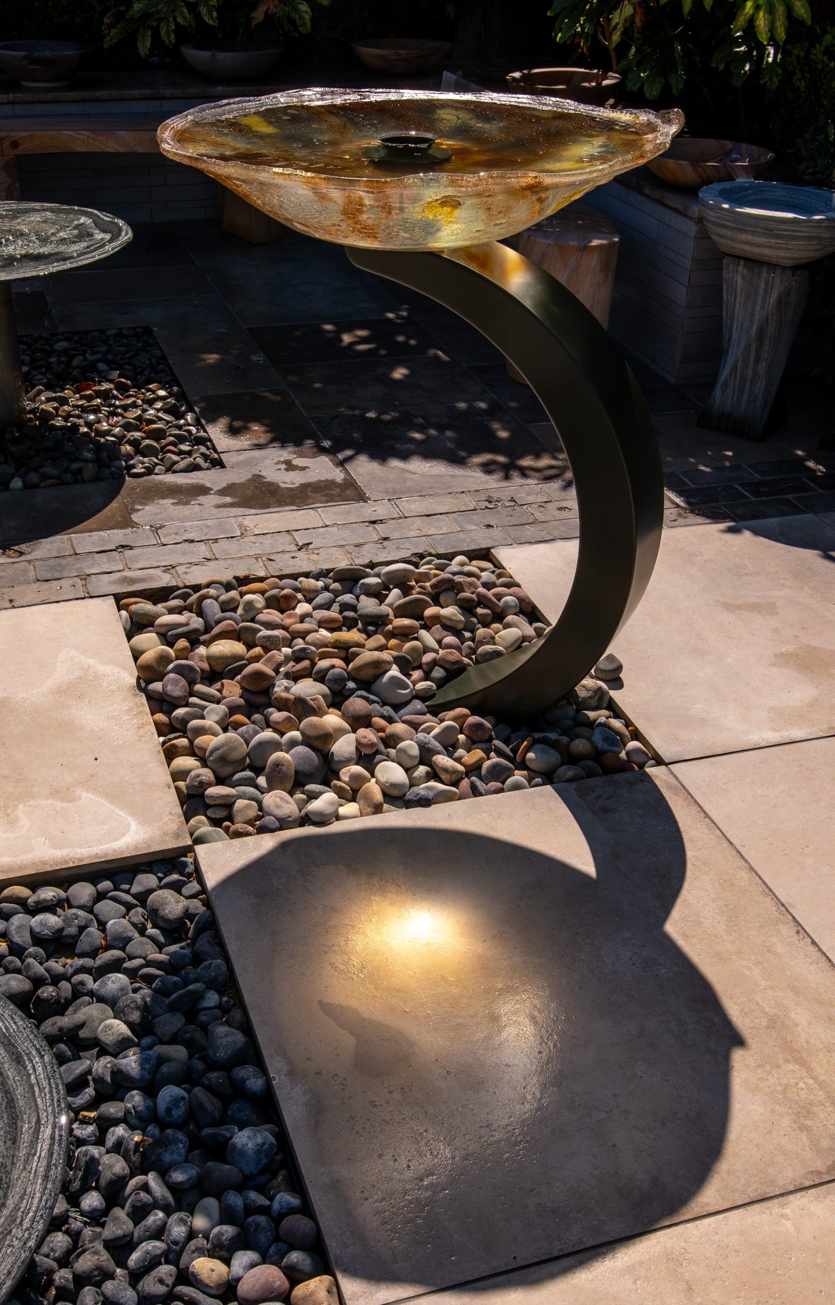 Adding the element of water to a piece of art, not just a vessel of stone or acrylic, requires some additional steps and care. Our own glass features have been running in our gardens for many years, in all weathers, and have remained strong and beautiful.