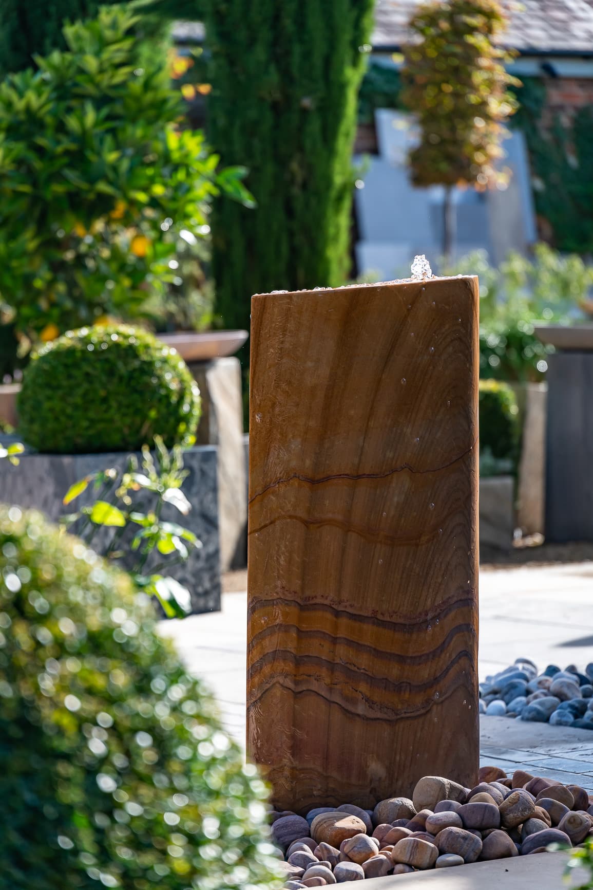 This is a modern monolith with a tear drop peak with the eye of the tear drop creates a bubble pool effect with the water coating the whole surface of the monolith.