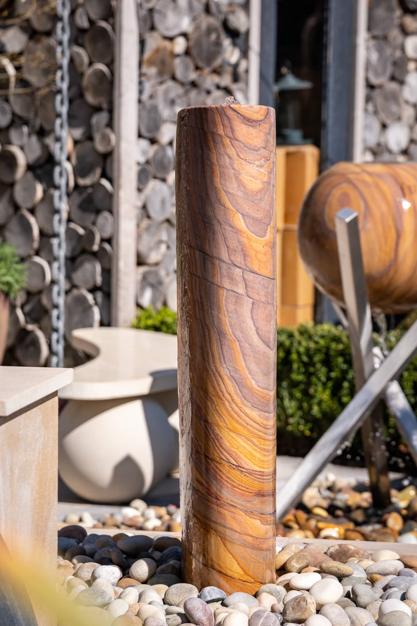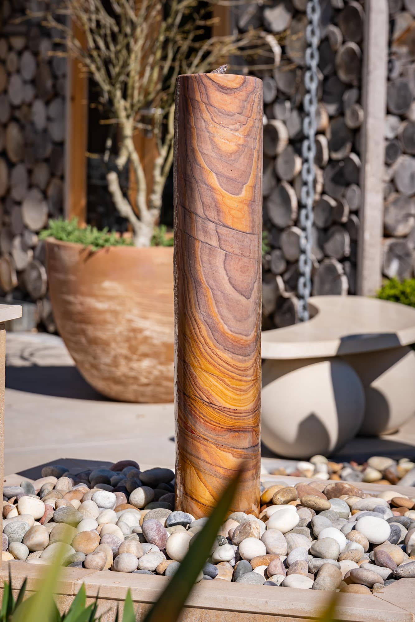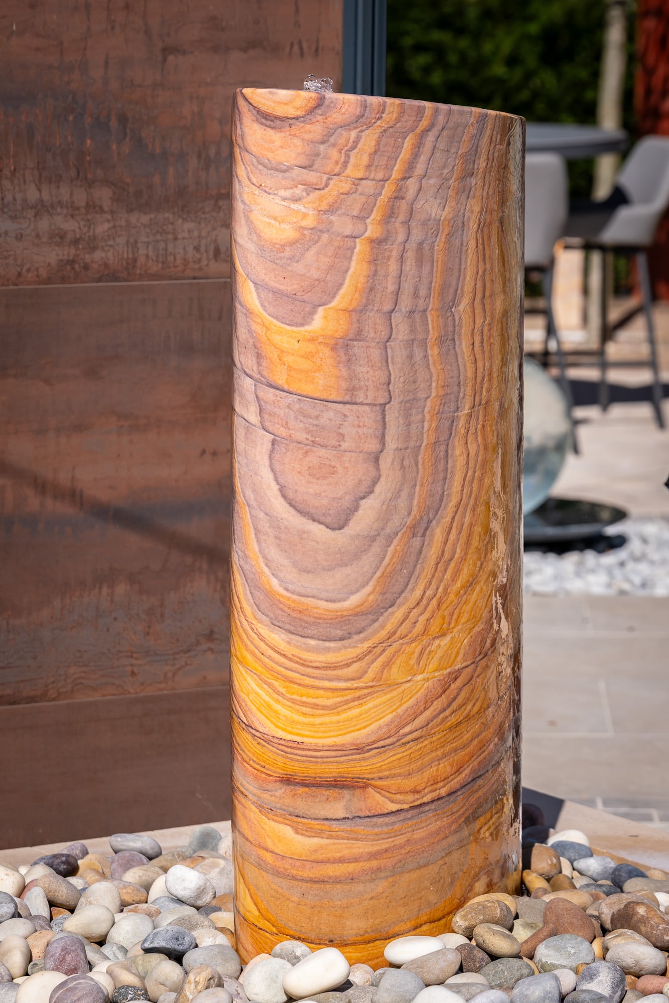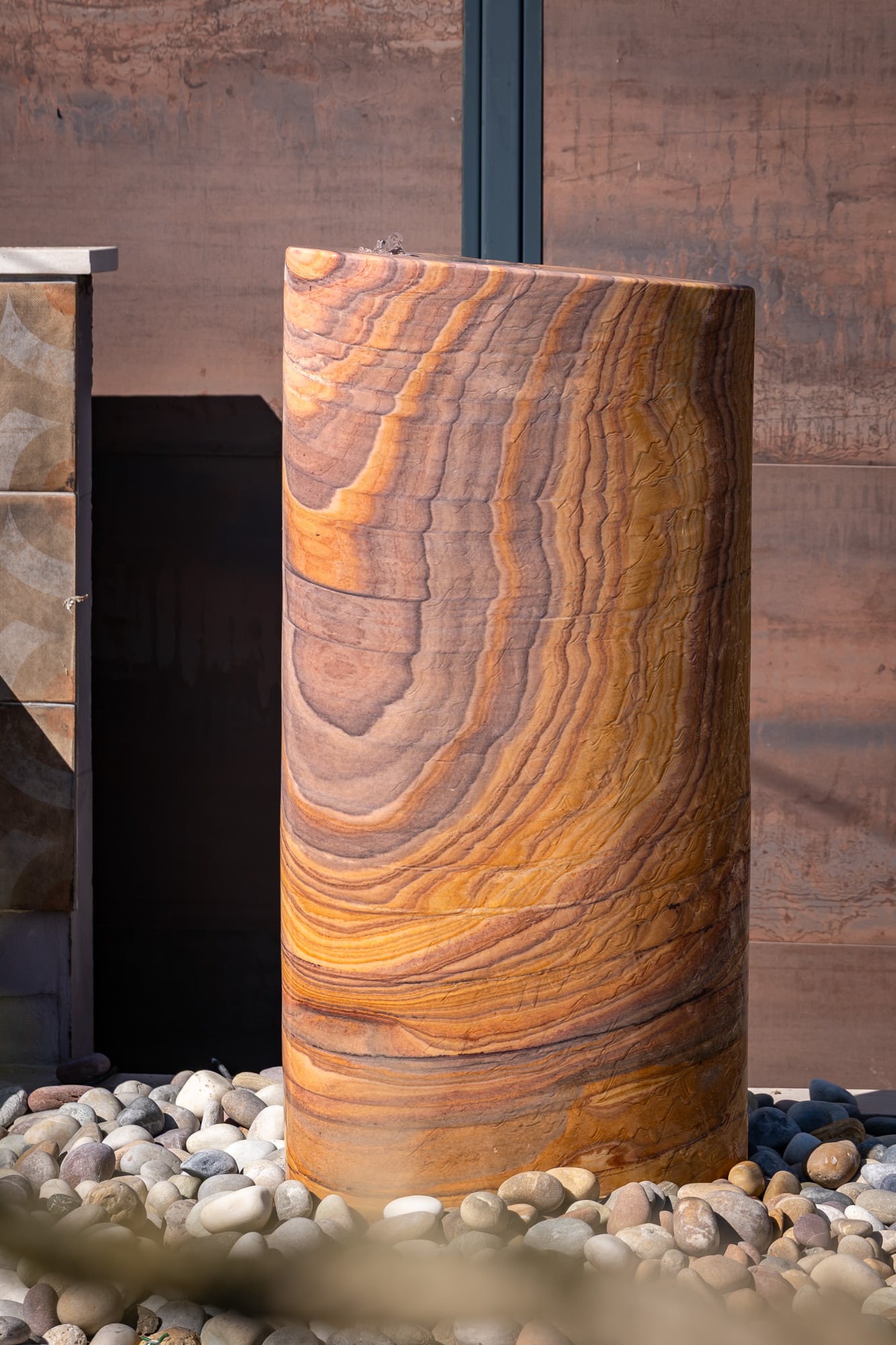 Made from a single block of the highest grade of natural Rainbow sandstone, each water feature exhibits individual patterns and graining with hues of lavender, plum, orange, pearl and brown.